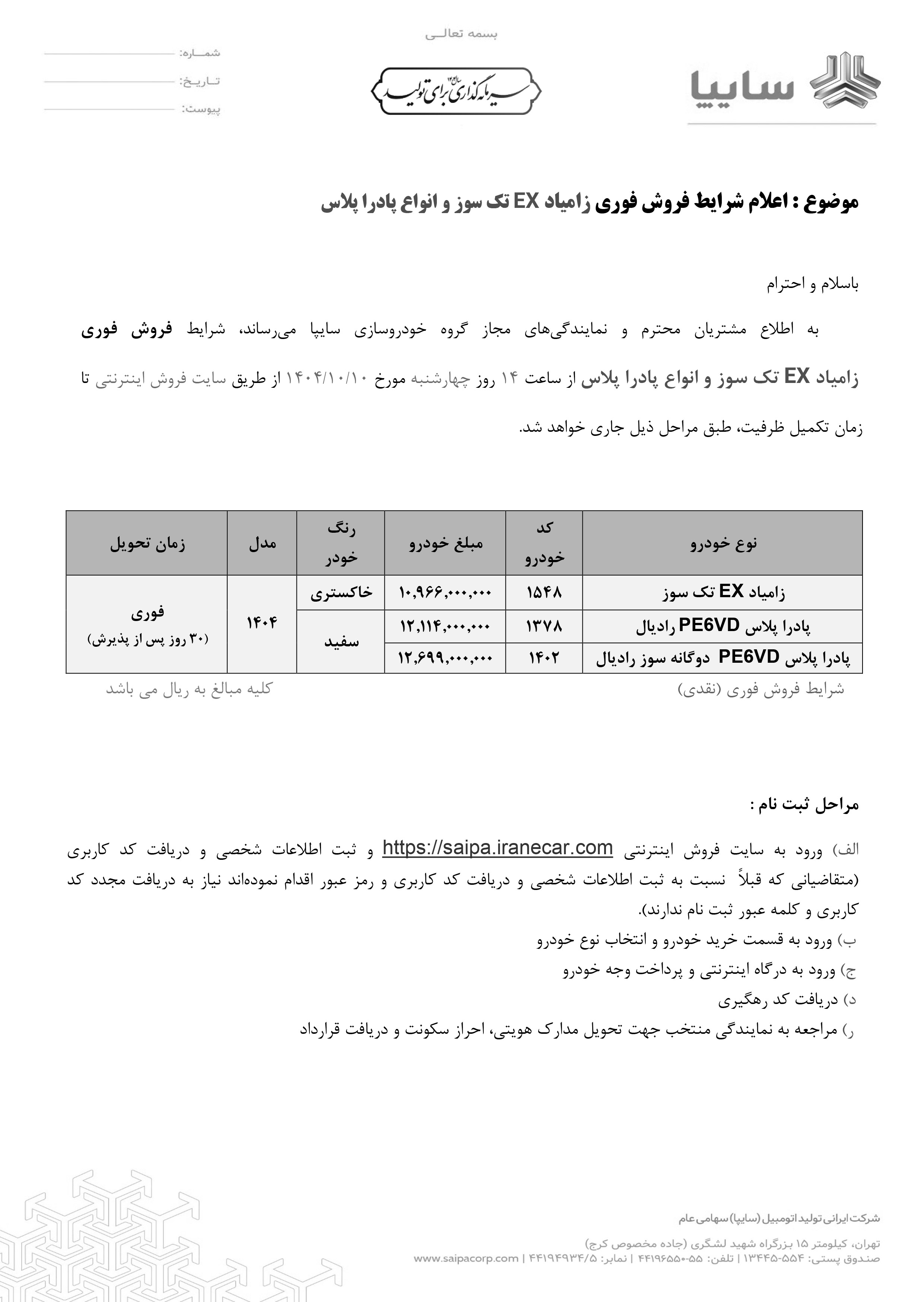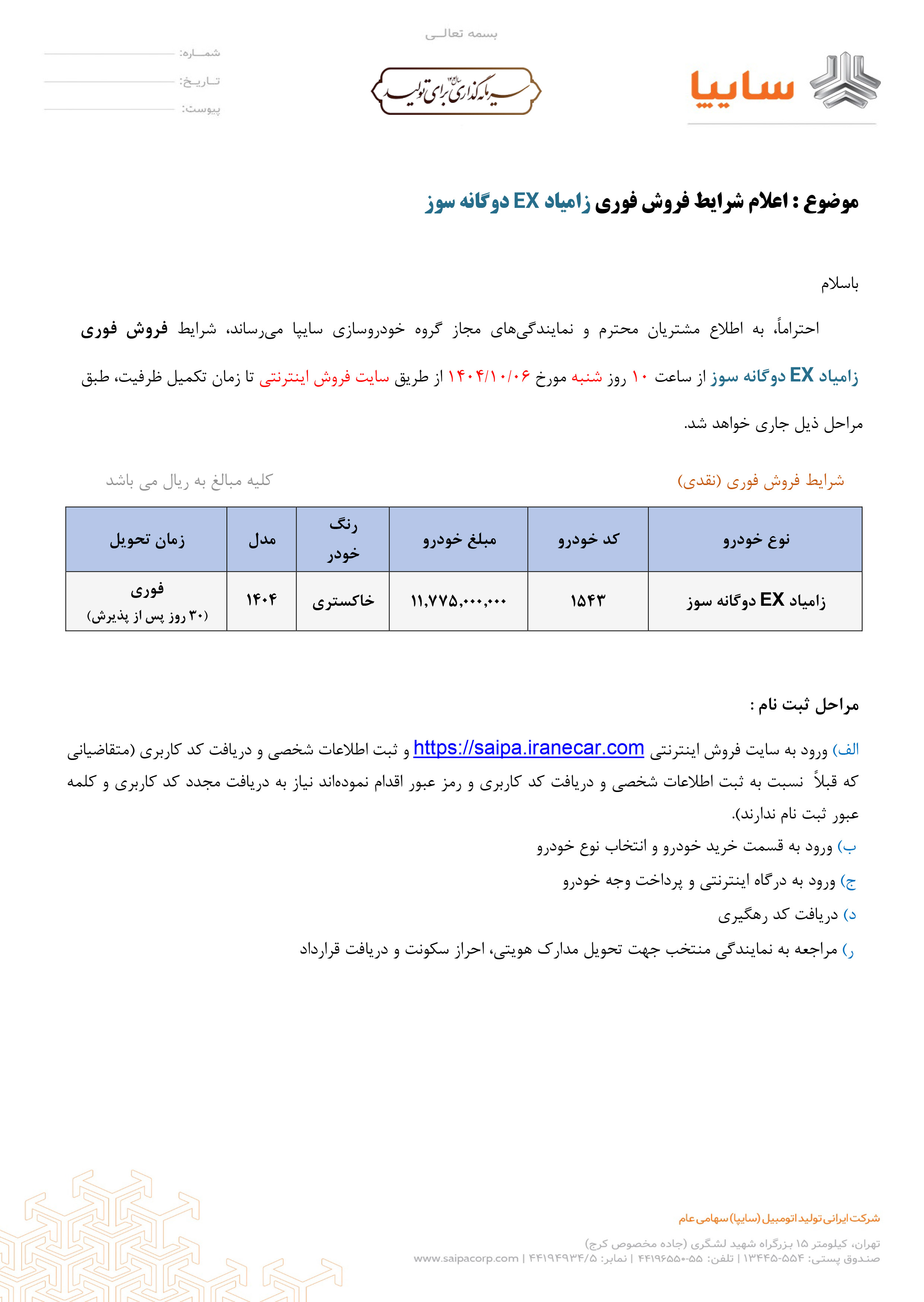 از ساعت 10 صبح روز چهارشنبه مورخ 1404/08/28 مرحله جدید فروش نقدی و اعتباری وانت اکستند زامیاد، آغاز شده و تا زمان تکمیل ظرفیت نیز ادامه خواهد داشت:
