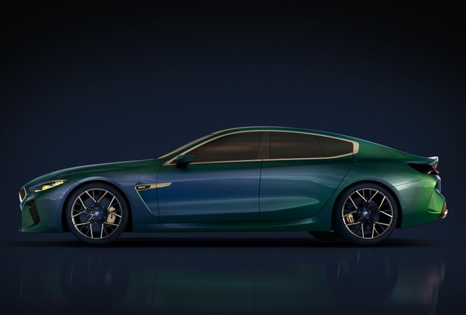 این کانسپت یک کوپه چهار در است با خط سقف شیبدار که نهایتاً به کاپوت عقب متصل میشود. کاپوت دراز و پنجره زاویهدار خودرو در جلو، ظاهر آن را بسیار اسپرتتر کرده است و در عین حال، طراحی عمیق قسمت جلو و دریچههای هوای بسیار بزرگ آن احتمالاً اشاره به عملکرد قوی M8 دارند. جلوپنجره طلایی خودرو نشان از لوکس بودن این خودرو دارد و چراغهای LED روشنایی روز شش ضلعی خودرو ما را به یاد مدل مسابقهای M8 GTE میاندازد. دریچههای ورودی هوا از جنس پلاستیک تقویت شده با فیبر کربن هستند تا وزن خودرو زیاد افزایش پیدا نکند.