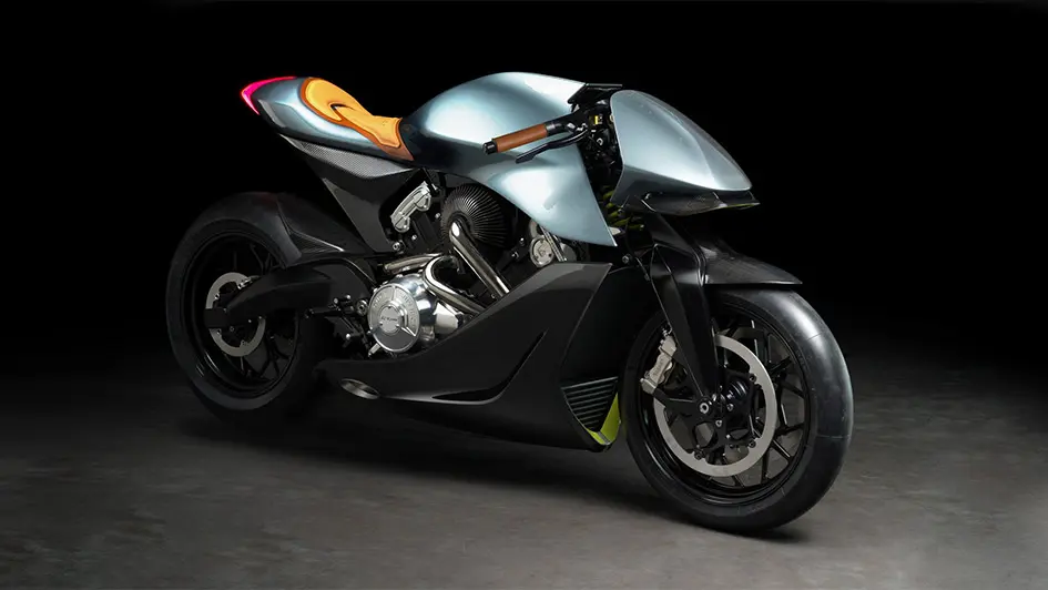 بدنه این موتورسیکلت خاص با رنگ سبزStirling پوشیده شده که قبلاً آن را روی بدنه خودروهای مسابقهای استونمارتین مشاهده کردهایم. فرم کلی بدنه آن را میتوان یادآور نمای جانبی خودروهای ساخت استونمارتین دانست.