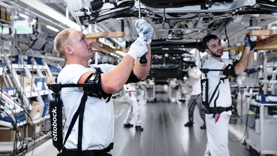 ”این ابزارها با محافظت از مفاصل و کاهش فشار بر روی ماهیچهها، شخص را در انجام کارها کمک میکنند.“آئودی برنامهای را در آلمان شروع کرده که هدف آن، بررسی و مقایسه دو نوع اکسوسکلتون است. این دو ابزار پوشیدنی مدرن برای شرایطی طراحی شدهاند که شخص مورد نظر مشغول کار در قسمت بالای سر خود باشد (به طور مثال، زمانی که یک کارگر در حالت ایستاده مشغول کار بر روی کف یک خودرو است). در چنین شرایطی، این ابزارها با محافظت از مفاصل و کاهش فشار بر روی ماهیچهها، شخص را در انجام کارها کمک میکنند.