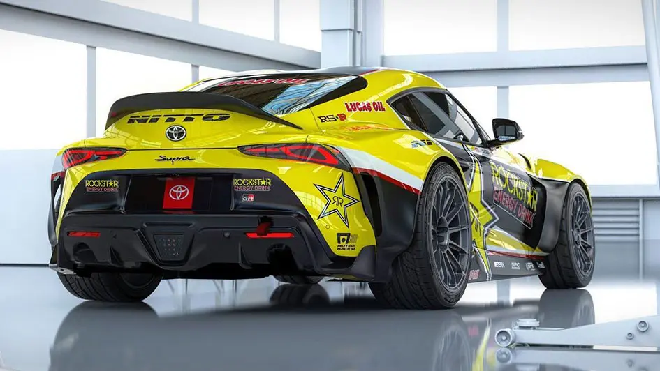 اولین نکته جالب توجه درباره این تویوتا سوپرا، کیت بدنه پهن آن شامل گلگیرها و هلالی چرخهای برآمده عقب است. این قطعات غیر از بخشیدن ظاهری خشن به چهره خودرو، به منظور ایجاد فضا برای نصب چرخهای بزرگ و همچنین یاری رساندن به راننده برای در اختیار داشتن زاویه فرمان کافی تغییر داده شده است. پوشش بدنه نیز با دو رنگ مشکی و زرد تزئین شده که البته نشان نوشیدنی انرژیزای Rockstar نیز روی آن به چشم میخورد.