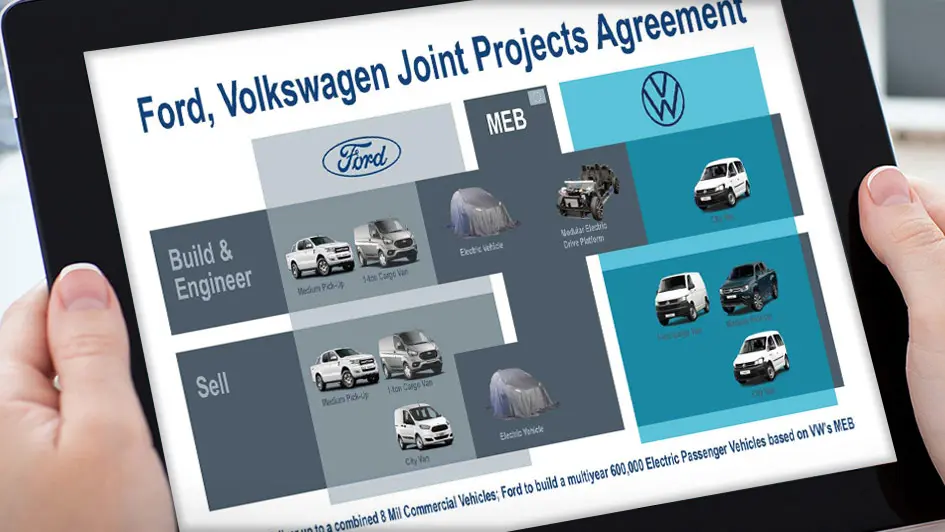 از یک سو قرار است فورد یک پیکاپ سایز متوسط و یک ون 1 تنی را وارد مشارکت کند و از سوی دیگر قرار است فولکسواگن دو ون سایز کوچک را توسعه دهد. این دو همچنین روی خودروهای مستقل برقی نیز شراکت خواهند کرد.
