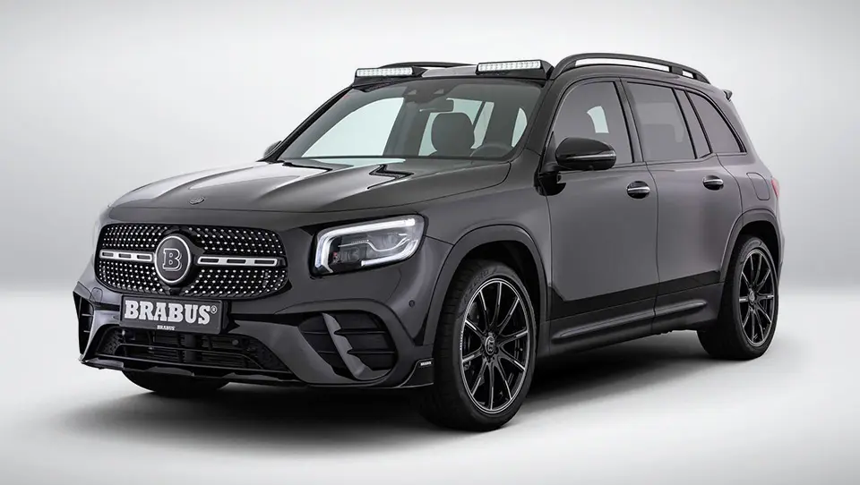امضای سنتی برابوس یعنی لوگوی B بزرگ انگلیسی در این شاسیبلند نیز به جای لوگوی مرسدسبنز دیده میشود. نصب دو ردیف چراغ LED روی سقف نه فقط جذابیتهای ظاهری و قابلیتهای کاربردی GLB برابوس را افزایش داده بلکه یادآور برادر بزرگترش G کلاس است.
