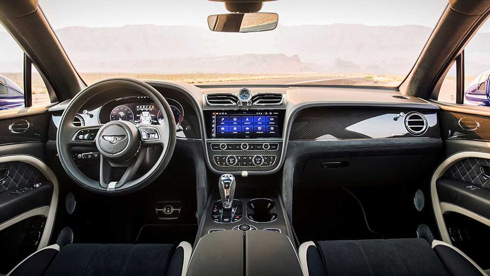در فضای کابین هم بنتلی بنتایگا اسپید به واسطه پوشش تیره قسمتها با دوخت متضاد و با طرحی خاص در لبه صندلیها و بخش پایینی داشبورد خود را از سایر نمونههای بنتایگا متمایز نموده ضمن اینکه لوگوی Speed نیز روی پشتی صندلیها، سطح داشبورد و دستگیره داخلی درها دیده میشود.