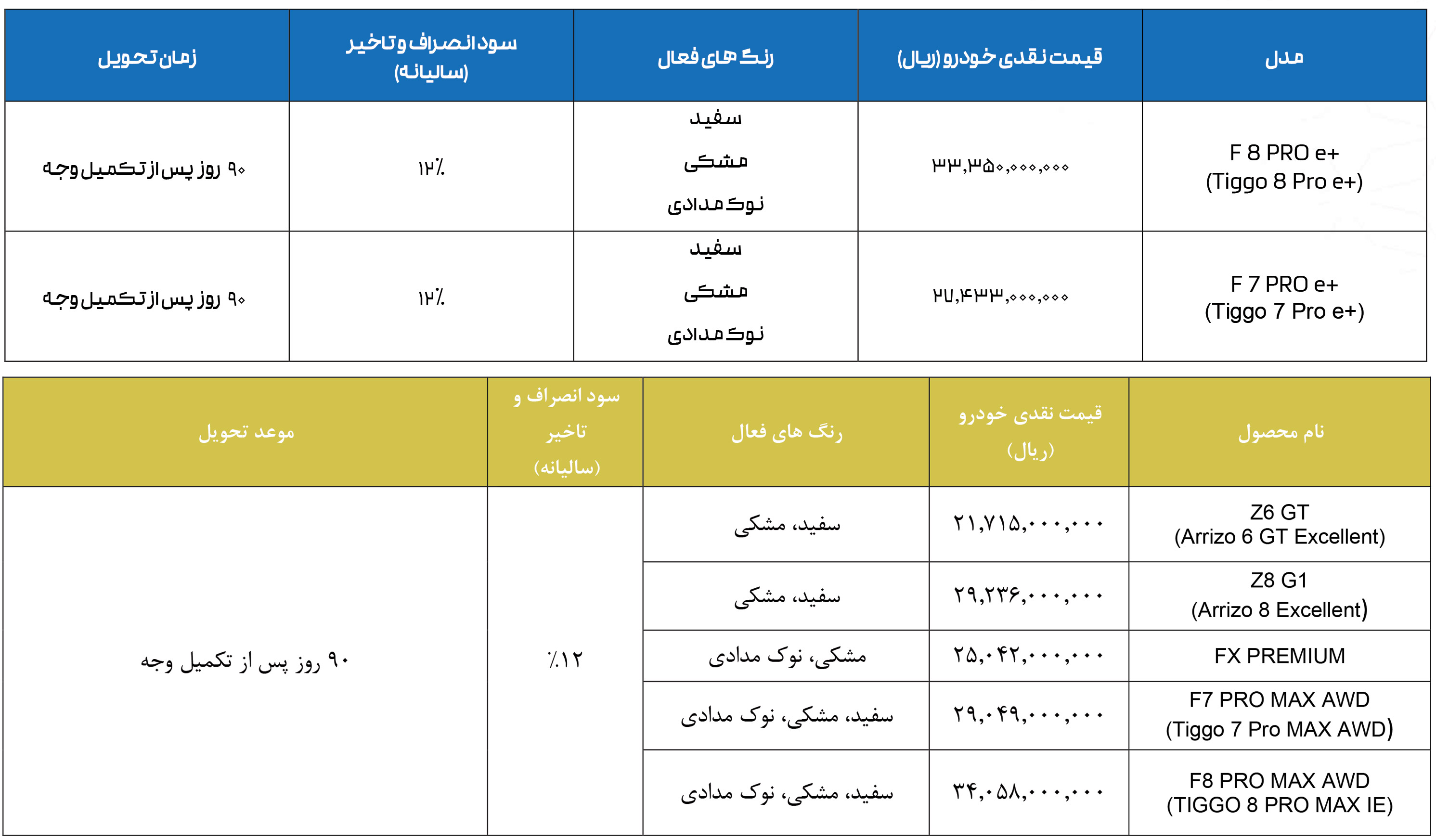 ثبت نام جدید فونیکس، ویژه متقاضیان خرید تیگو 7 بنزینی و هیبریدی و همچنین آریزو 8، از روز چهارشنبه مورخ 1404/02/31 مطابق جدول زیر اعلام شده است: