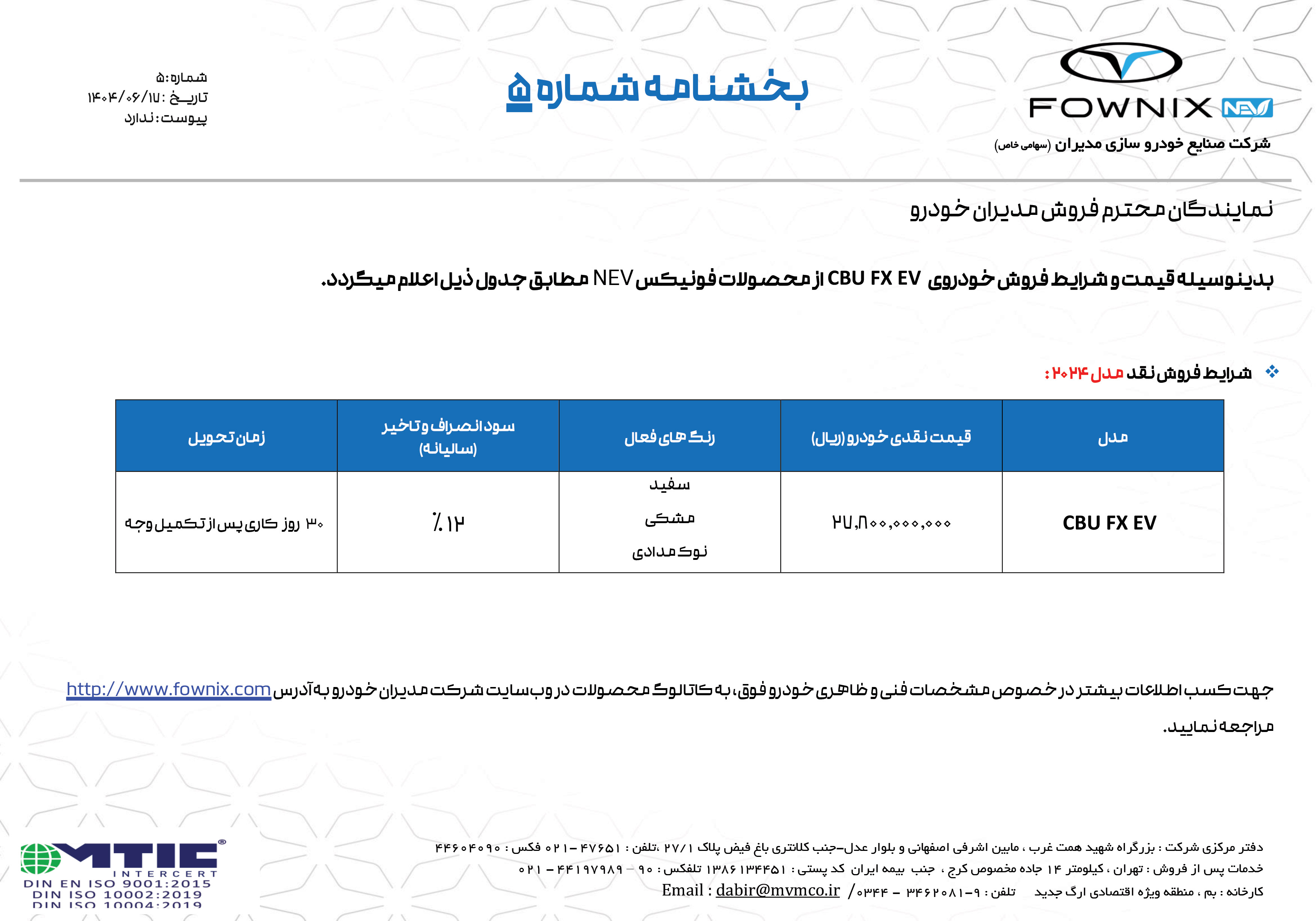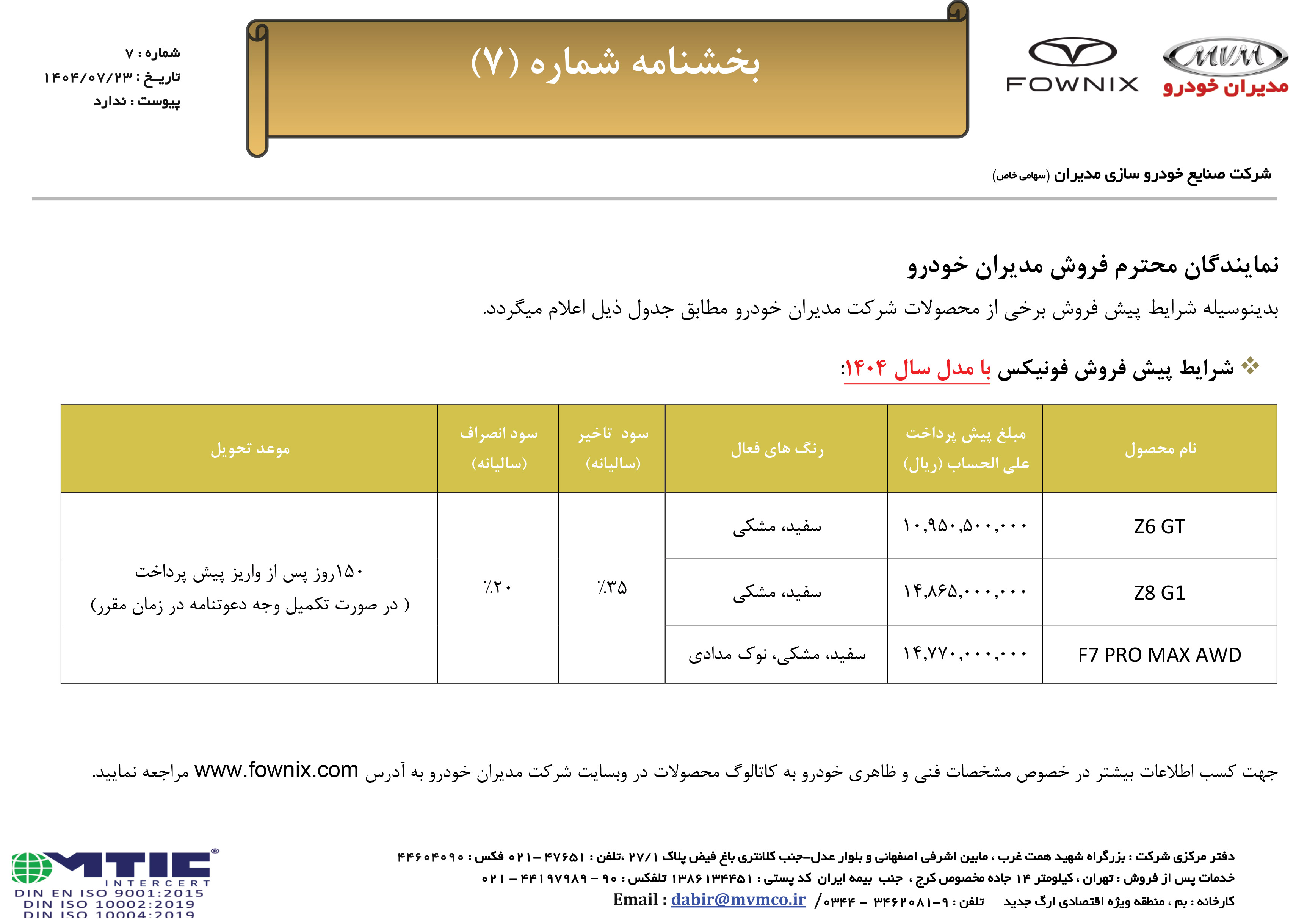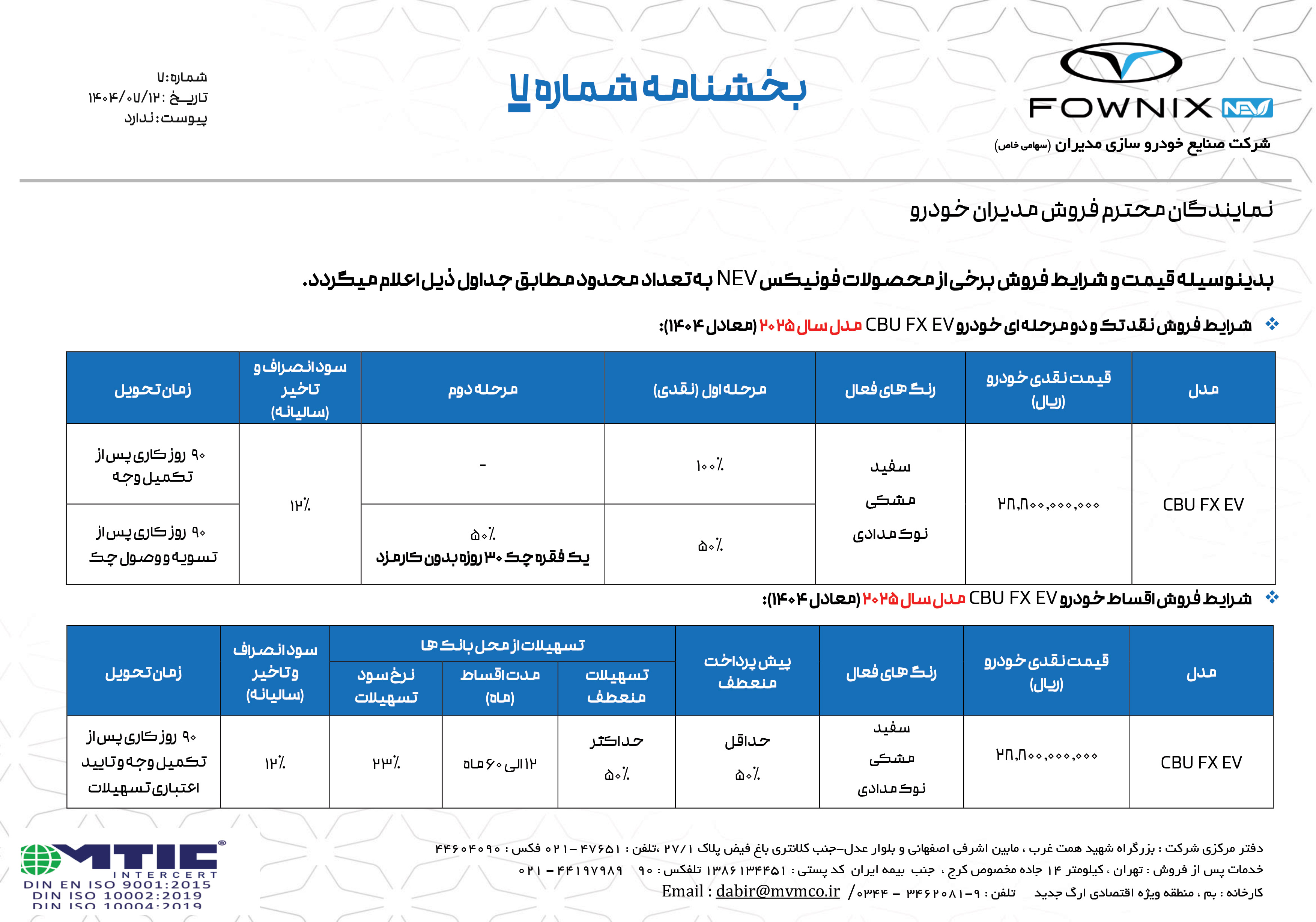 از روز شنبه مورخ 26 مهرماه 1404، افزایش قیمت ثبت نام خودرو فونیکس مطابق جدول زیر، رسما به نمایندگیهای شرکت مدیران خودرو، ابلاغ شده است: