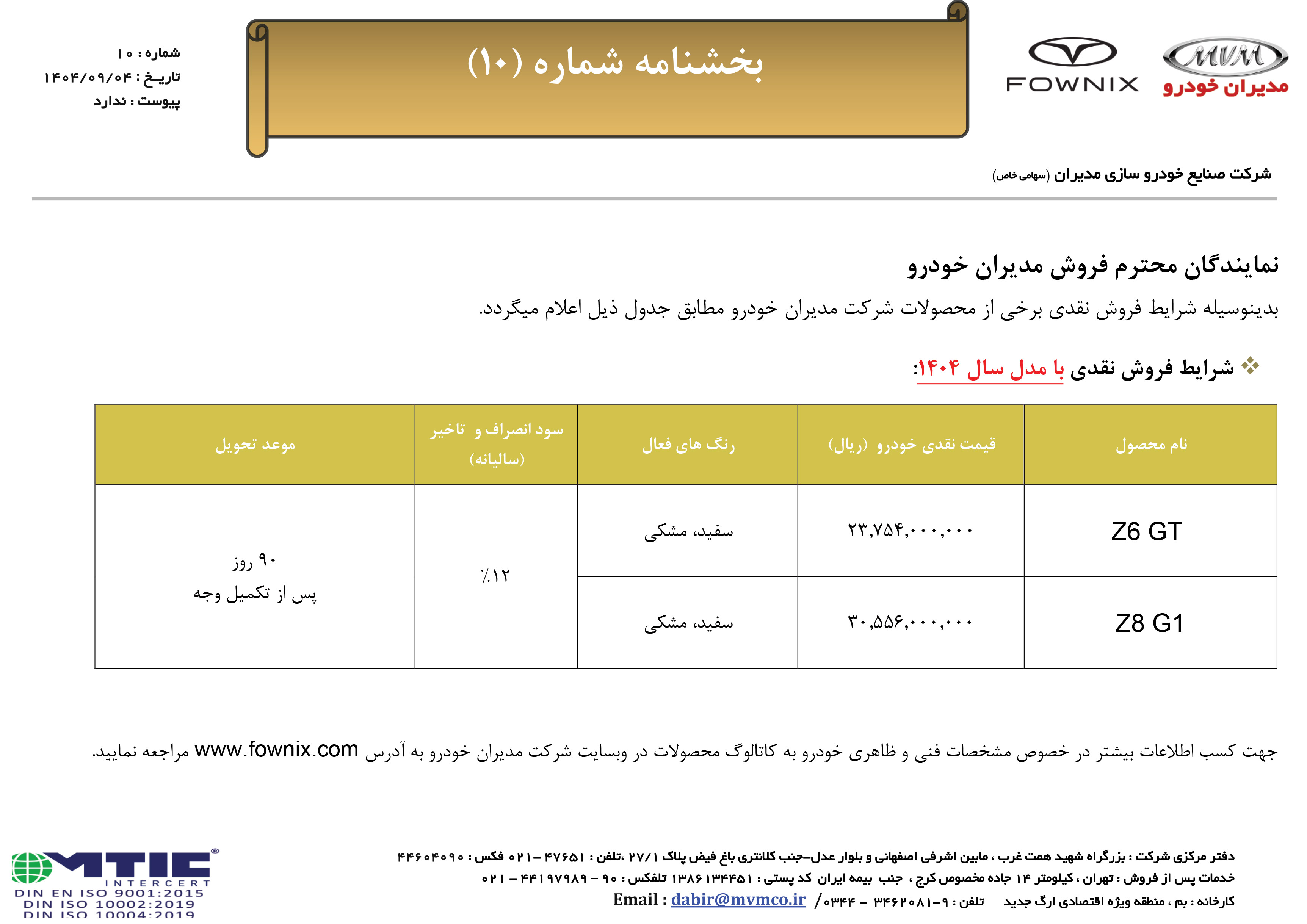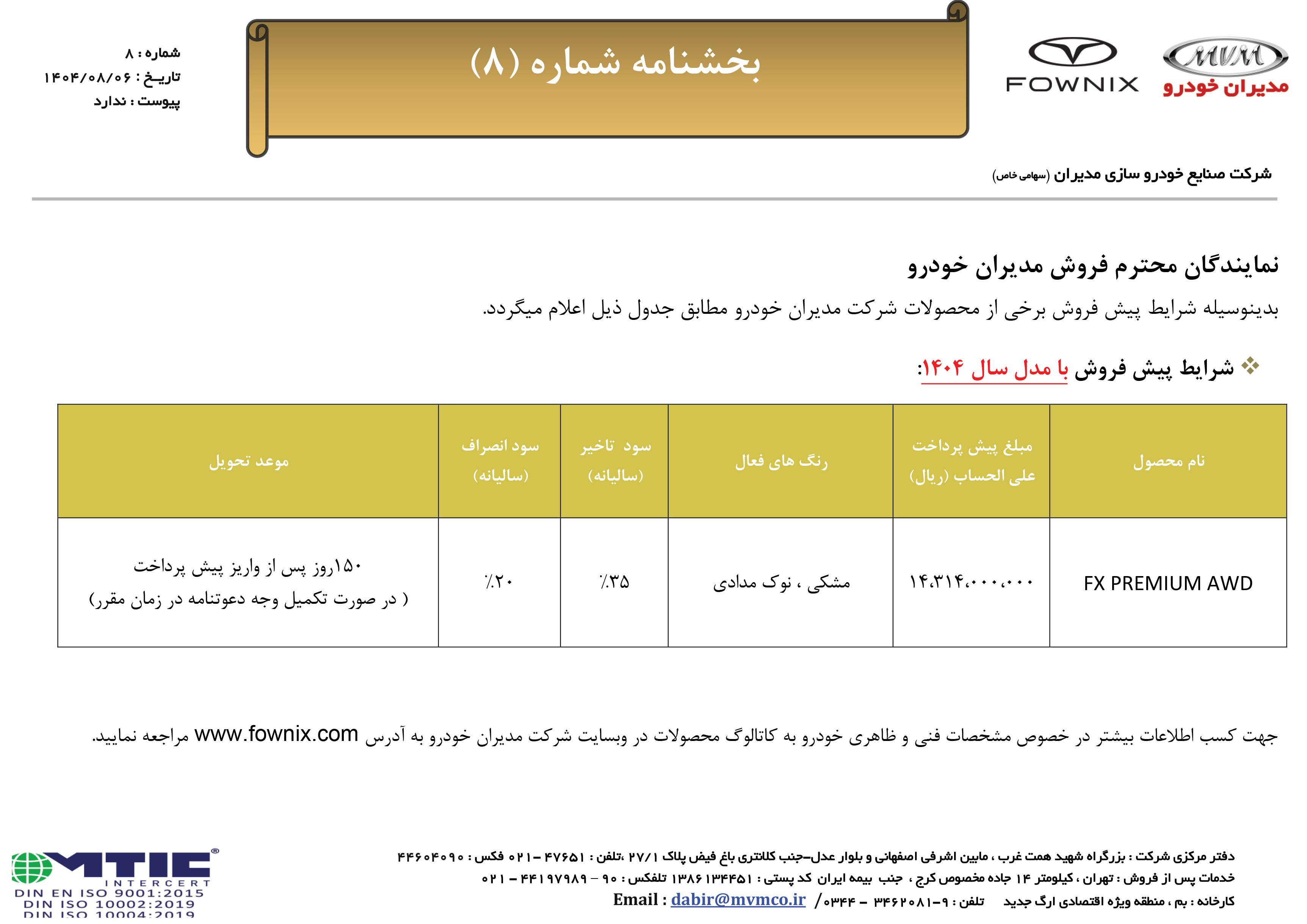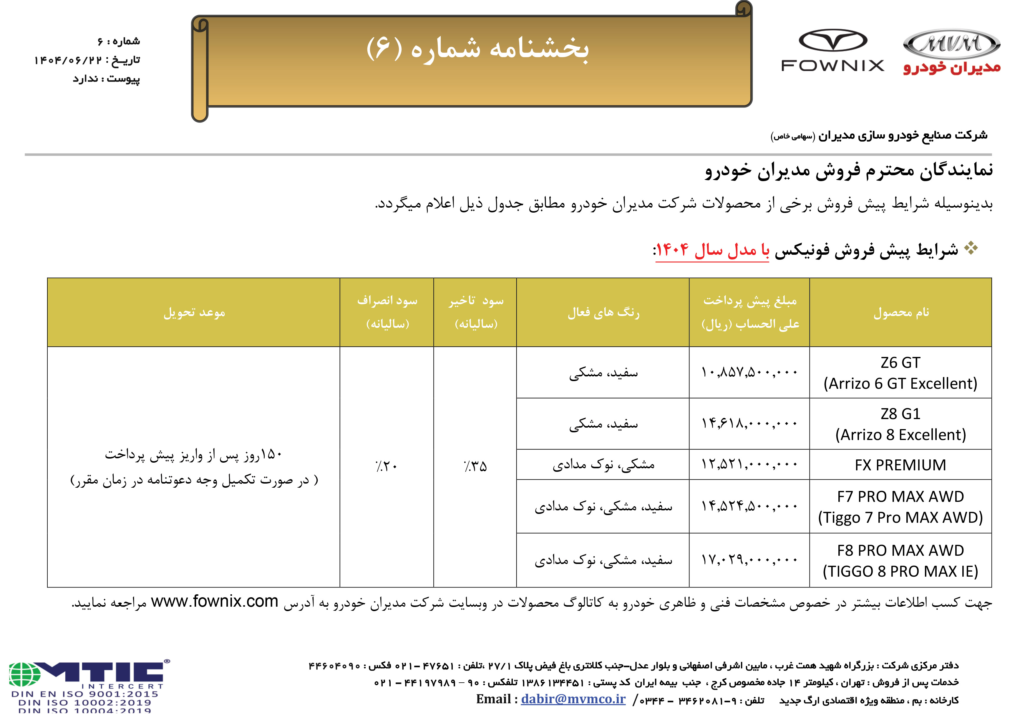 شرکت مدیران خودرو از تاریخ 21 آبانماه 1404، قیمت ثبت نام محصولات فونیکس را مطابق جدول زیر، افزایش داده است: