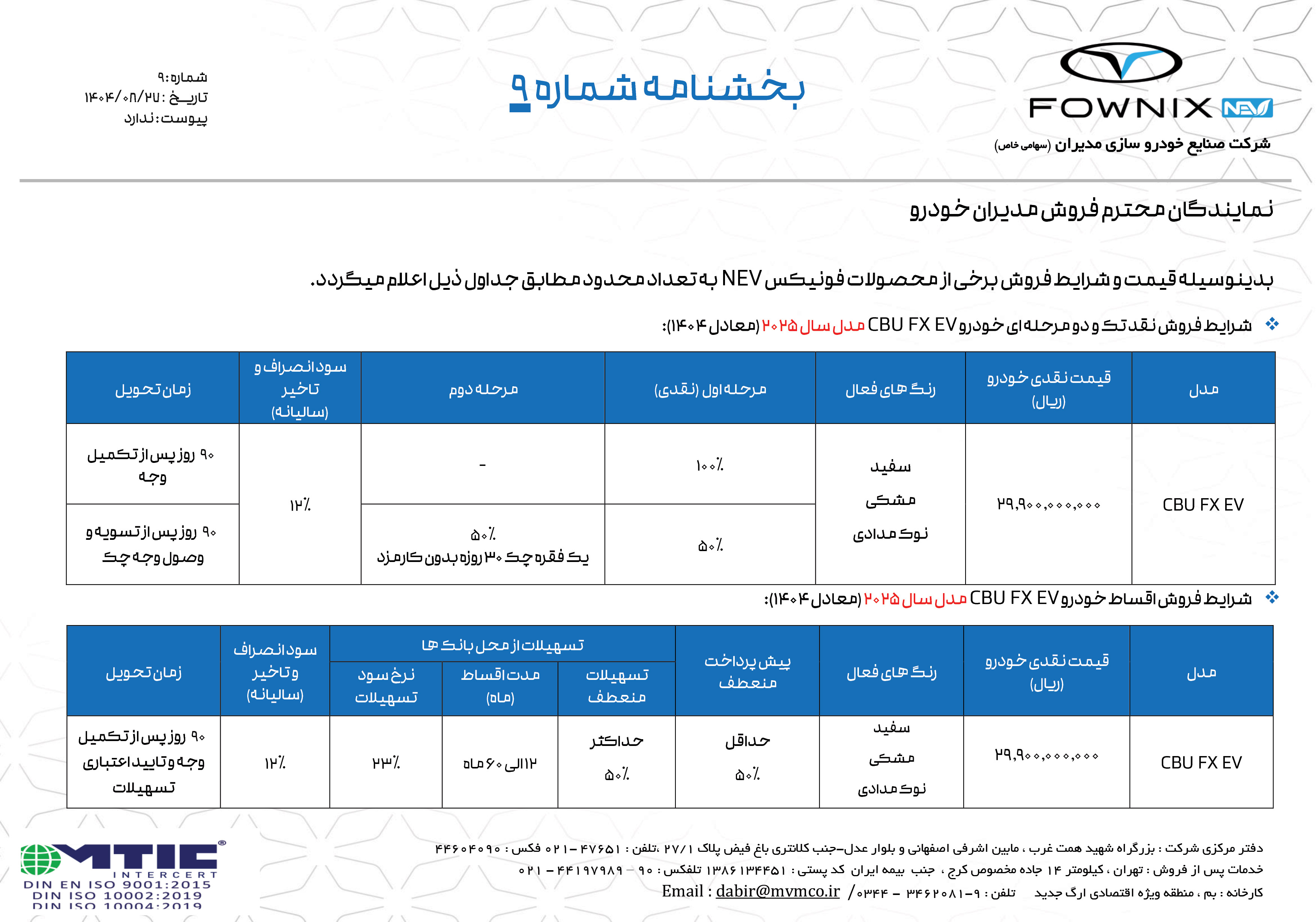 همزمان با اعلام قیمت جدید فونیکس افایکس برقی، شرکت مدیران خودرو نیز از تاریخ 1404/08/27 شرایط فروش نقدی و اقساطی فونیکس FX برقی را مطابق جدول زیر اعلام کرده است:
