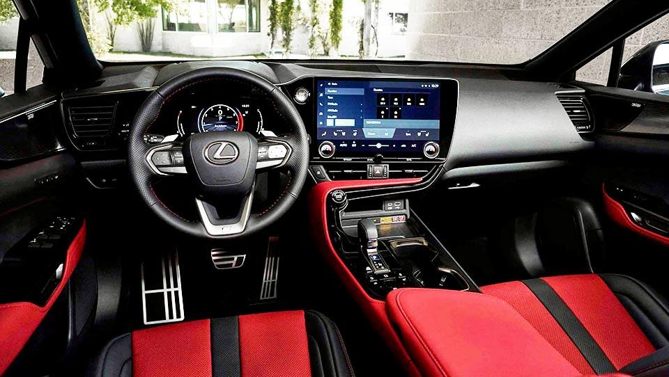 ترکیب رنگ فضای داخلی را میتوان از میان مشکی، مشکی و کرم تیره، پالومینو (ترکیبی از کرم، طلایی و قهوهای روشن) و قرمز Rioja NuLuxe انتخاب کرد، ضمناینکه برای تریم داخلی هم روکش چوب مشکی Black Open Pore یا قطعات منشوری 3 بعدی به رنگ مشکی قابل سفارش است. سقف پانوراما شیشهای با قابلیت باز شدن هم یکی دیگر از ویژگیهای جدید کابین لکسوس NX است.