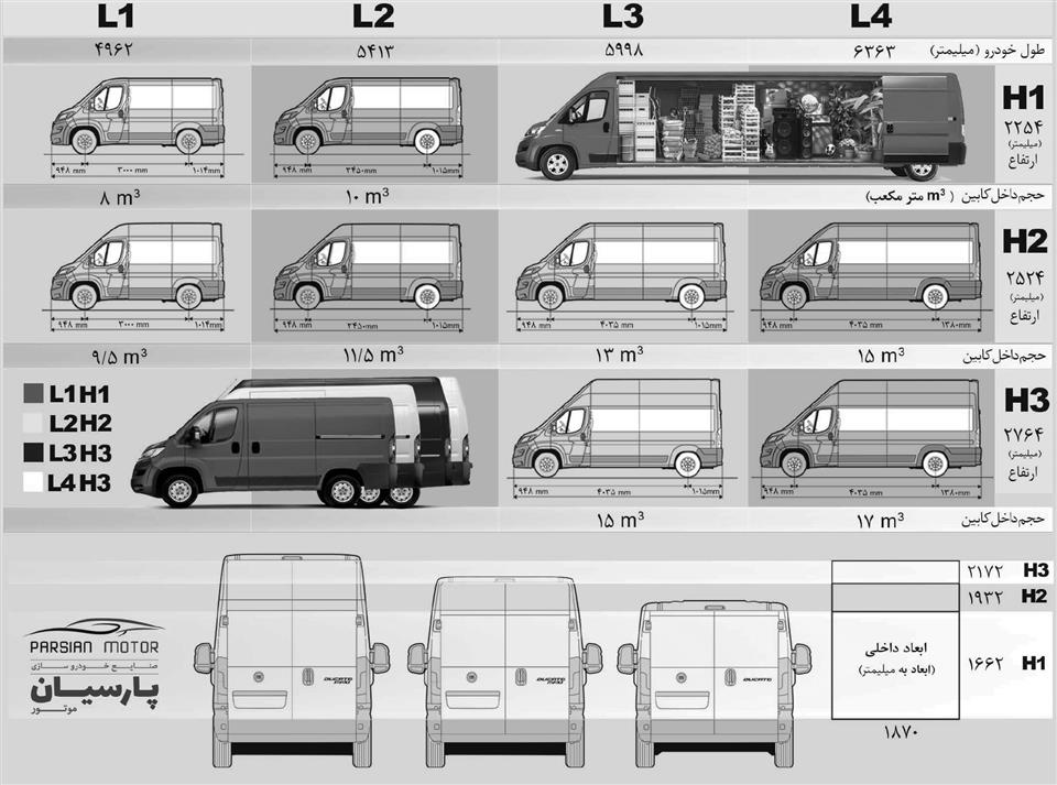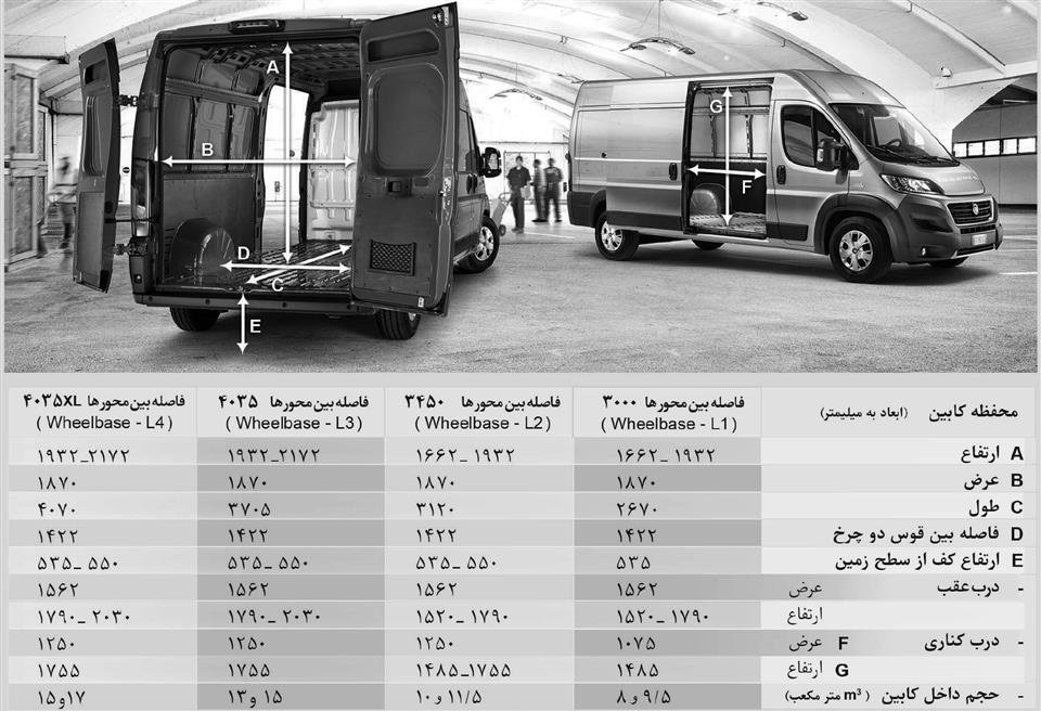همچنین در جدول زیر، میتوانید تفاوت ابعاد اتاق در هر چهار تیپ فیات دوکاتو را مشاهده کنید.