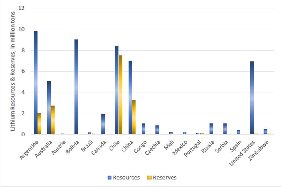 استرالیا و شیلی تولیدکنندگان لیتیوم به صورت انبوه هستند که تمامی لیتیومهای موجود در باتری خودروهای برقی و هیبرید، همچنین وسایل الکترونیکی قابل حمل را تولید میکنند. استرالیا، لیتیوم خود را از اسپودومن غنی از لیتیوم تولید میکند و شیلی از نمکزارها.