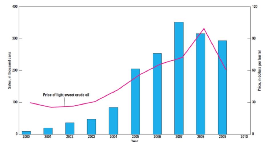 در نمودار زیر افزایش درخواست برای خودروهای هیبریدی و برقی در پی افزایش قیمت نفت خام نمایش داده شده است: