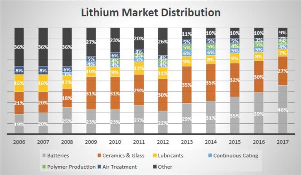 در شکل زیر سهم صنایع مختلف از مصرف لیتیوم نشان داده شده است: