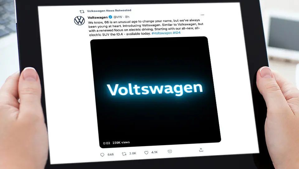 خبر تغییر برند فولکس‌واگن به ولتس‌واگن از سوی شرکتی بزرگ و قدیمی خیلی سریع جدی گرفته شد، اما فولکس‌واگن اعلام کرد چنین برنامه‌ای ندارد و ولتس‌واگن یک شوخی بوده!مطابق یک سنت قدیمی درست مانند آنچه در ایران به اسم دروغ سیزده معروف است، در غرب نیز چنین چیزی با عنوان روز احمق‌ها یا دروغ اول آوریل مطرح است. شوخی که البته با هدف خنده و سرگرمی مطرح می‌شود ولی گاهی هم این شوخی کار دست گوینده‌اش می‌دهد.