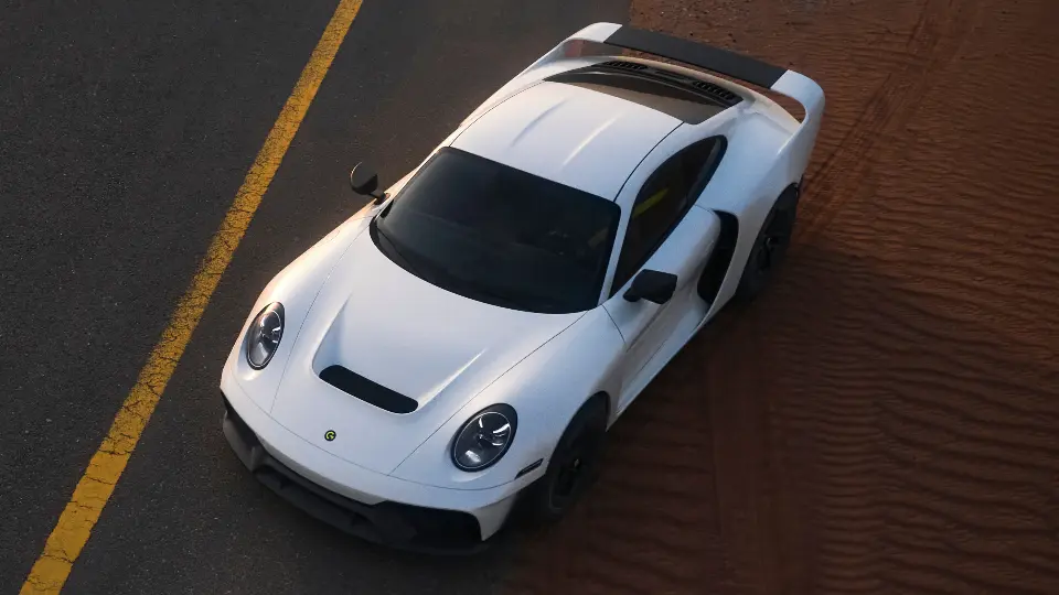”این خودرو در واقع یک 911 توربو S از نسل 992 است، که با ارتفاع 250 میلیمتر از سطح زمین در حالت آفرود، 120 میلیمتر در حالت جادهای و بدنهای تماماً فیبرکربنی، برای صحرانوردی ساخته شده است.“این هایپرکار آفرودی را میتوانیم تفسیری مدرن از مدل افسانهای 959 در نظر بگیریم. در واقع یک 911 توربو S از نسل 992 است، که با ارتفاع 250 میلیمتر از سطح زمین در حالت آفرود، 120 میلیمتر در حالت جادهای و بدنهای تماماً فیبرکربنی، برای صحرانوردی ساخته شده است.
