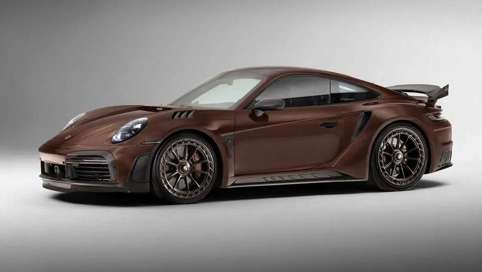 ”سفارش کیت بدنه فیبرکربنی 113,185 دلار خرج دارد؛ و افزودن رنگی به فیبرکربن (مانند این پورشه قهوهای رنگ) 28,250 دلار به قیمت نهایی اضافه میکند.“هفتمین نسخه از این خودرو با رنگ قهوهای ساخته شده که ظاهری منحصربهفرد دارد. به نمای بیرونی آن یک کیت کامل بدنه فیبرکربنی با رنگ شکلاتی اضافه شده و قسمتهای جدیدی نیز مانند کاپوت مجهز به اسپویلر پایین شیشه جلو، هواکشهای روی گلگیرهای جلو و رکابهای جانبی با دندانه، وجود دارد.