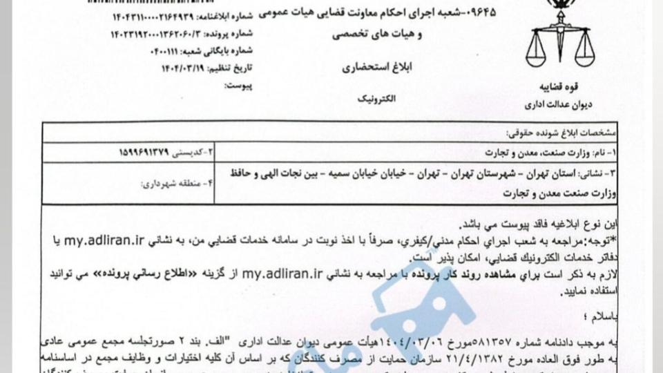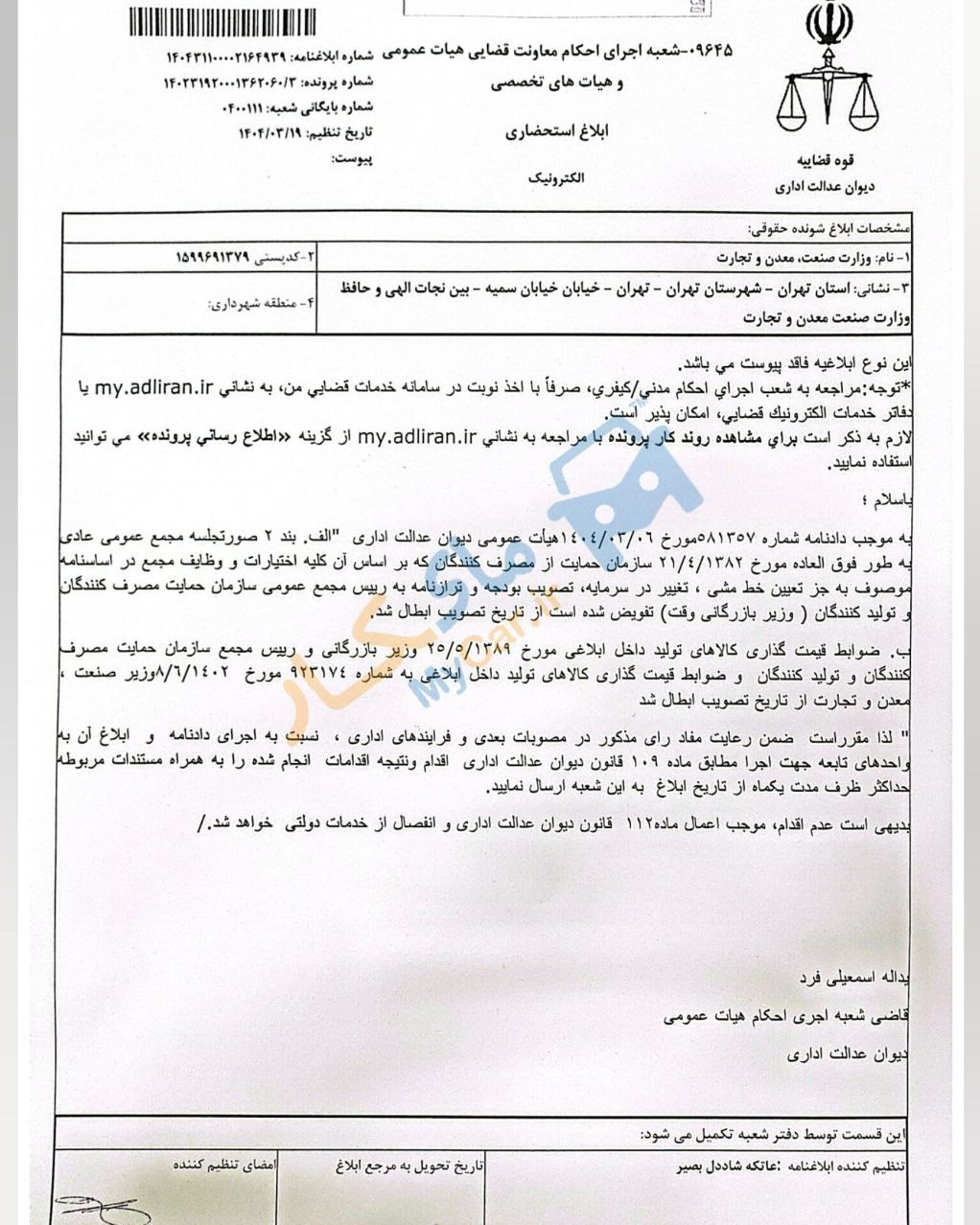 خرداد 1404: دیوان عدالت اداری قوه قضاییه، ضوابط قیمت گذاری خودرو توسط وزارت صمت و سازمان حمایت را باطل اعلام کرد. بر این اساس، حکم اجراییه رای ابطال ضوابط برای وزارت صمت، سازمان حمایت در مورد قیمت گذاری با اعلام ضمانت اجرای استنکاف مبنی بر انفصال از خدمات دولتی وزیر صمت ابلاغ شد. در حکمی که از سوی دیوان عدالت اداری صادر شده، آمده است:
