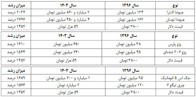 دی 1403: بر اساس گزارشی که مرکز پژوهشهای مجلس شورای اسلامی منتشر کرده، مقایسهای بین قیمت خودروهای وارداتی، مونتاژی و تولیدی در شهریور 1396 و مرداد 1403 انجام شده که نشاندهنده رشد شدید قیمتها است. به گزارش خبرگزاری فارس، این روند نشاندهنده تأثیر مستقیم نوسانات تولید، واردات و شرایط اقتصادی بر قیمت خودروها در بازار است.