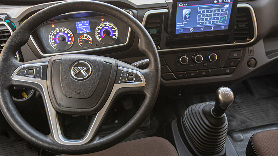 همچنین طراحی فضای داخلی این کامیونت نیز بسیار خوب است و با توجه به کیفیت متریال و مواد سازنده داخل کابین، میتوان در این قسمت به آن نمره خوبی داد. داشبورد طراحی ساده و زیبایی دارد و قرارگیری یک صفحهنمایش 10 اینچی در وسط داشبورد، آن هم به سبک طرحهای امروزی که برجسته و بیرونزده است، نمای این بخش را زیباتر و بهروزتر میکند.