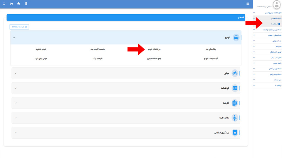 بعد از ورود به سامانه سخا، از منوی کاربریو همانند تصویر زیر، گزینه «خدمات استعلامی» را انتخاب کرده و در قسمت خودرو، گزینه «ریز تخلفات خودرو» را کلیک میکنیم. حال با پرداخت تعرفه دولتی، نتیجه استعلام خلافی را مشاهده کرده و در صورت نیاز، اعتراض به جریمه رانندگی را ثبت میکنیم.