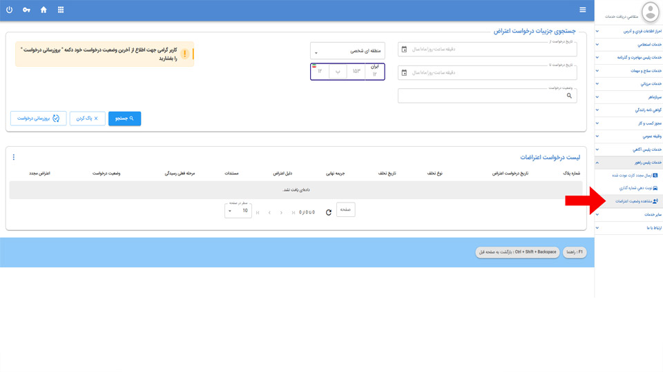 برای مشاهده نتیجه اعتراض به خلافی خودرو، بازهم باید از سامانه سخا استفاده کنیم ولی اینبار از منوی کاربری، گزینه «خدمات پلیس راهور» و سپس گزینه «مشاهده وضعیت اعتراض» را انتخاب میکنیم.
