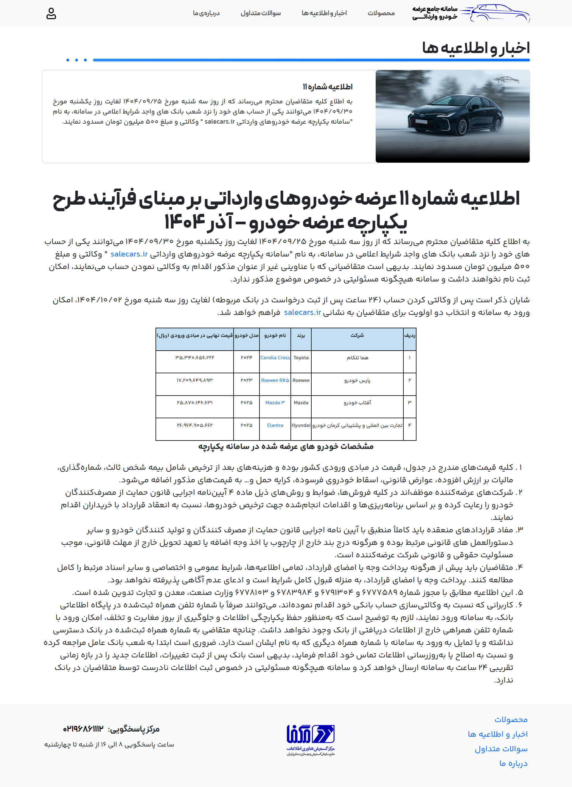 فروش جدید خودروهای وارداتی از طریق سامانه یکپارچه، از روز چهارشنبه مورخ 1404/09/26 آغاز شده و تا پایان روز سهشنبه مورخ 1404/10/02 نیز ادامه دارد. متقاضیان این مرحله از ثبت نام ماشین وارداتی، حداکثر باید «دو اولویت» را از میان سبد محصولات اعلام شده، انتخاب نمایند.