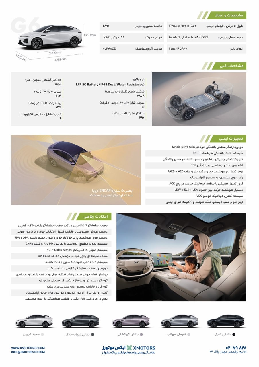 دی 1404: محصول جدید برند ایکس پنگ به نام G6 که سودای رقابت با تسلا مدل Y را در سر دارد، یک قدم دیگر به بازار ایران نزدیک شده است. شرکت ایکس موتورز قصد دارد این محصول برقی را به زودی رونمایی و عرضه کند. بنابراین اکنون کاتالوگ آن نیز دردسترس است: