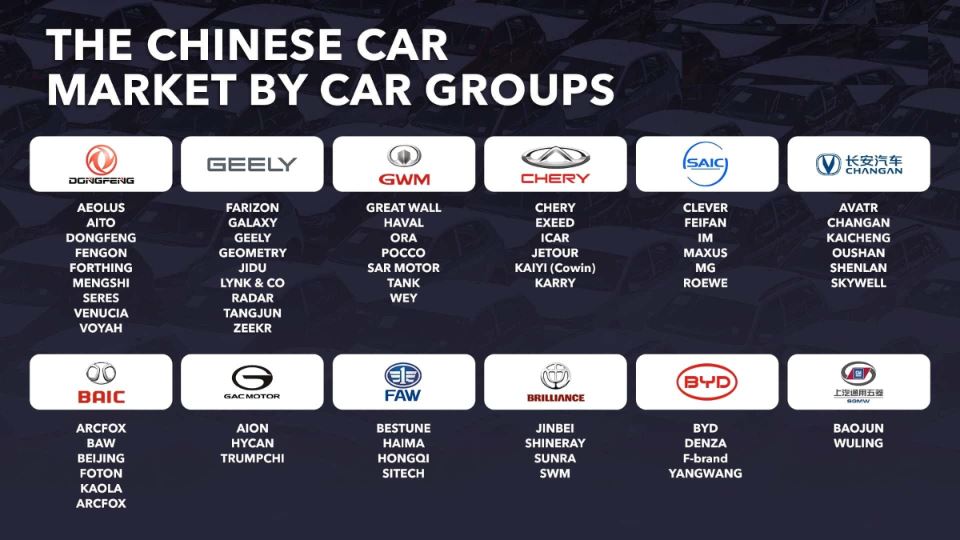 با تعیین استراتژی مشابه با بازار خودروی آمریکا در دهه 70 و 80 میلادی، اکنون محصولات مشترک با برندهای متفاوت عرضه میشود. 99 برند حاضر در بازار خودروی چین زیر چتر 40 گروه خودروساز قرار دارند، هرچند که تمام آنها موفق نبوده و حتی برخی از آنها در سالهای اخیر از گردونه حذف شدهاند.