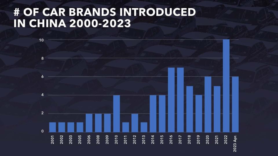 اما وضعیت بازار خودروی چین، تقریبا برعکس بوده است. در نخستین سالهای قرن فعلی، 25 برند خودروساز در چین فعال بودند که عموما به تولید خودروهای قدیمی اروپایی و ژاپنی برای بازار محدود داخلی این کشور میپرداختند. بین سالهای 2001 تا 2010، 14 برند دیگر به جمع برندهای موجود اضافه شد.