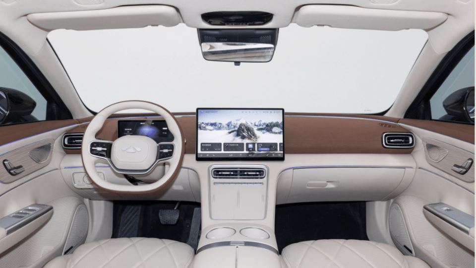 کابین خودرو با ترکیب رنگهایی مانند بژ و قهوهای همراه است و تعداد دکمههای فیزیکی نیز به حداقل رسیده است. یک نمایشگر 15.6 اینچی نیز در کابین آن دیده میشود.