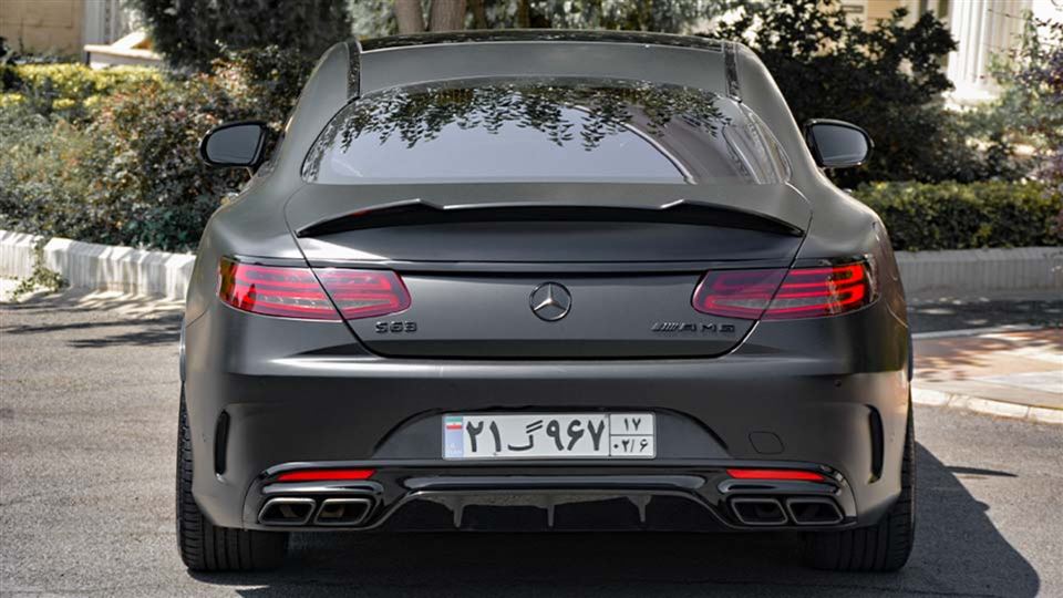 بخش اسپرت مرسدس انگار در نمای عقب جسورانهتر عمل کرده است. اول از همه آن اسپویلر ثابت بریدهشده را میبینیم که با انحنایی هماهنگ با زوایای بدنه، خیلی حرفهای و شیک نصب شده است. پایینتر که میآییم دیگر خبری از آن ورقهای باریک استیل کرومی نیست. حالا یک نوار مشکی روی چراغ عقبهایی نصب شده که خودشان هم پوششی تیرهتر نسبت به مدل استاندارد دارند. لوگوی مرسدس دیگر ستاره نقرهفام نیست. اینجا یک کسوف تاریک را شاهد هستیم. حتی نوشتههای S63 و AMG در دو طرف هم مشکیرنگ شدهاند. در پایینترین قسمت پشت خودرو، بهدرستی وقت نصب فریم براق دیفیوزر با اگزوزهای چهارضلعی در دو طرفش است.