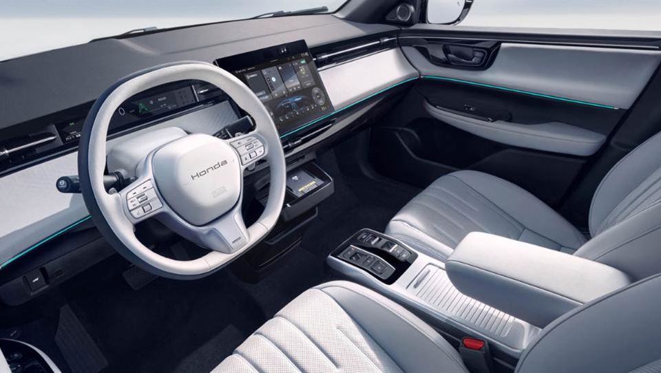 در تصویری که از فضای کابین هوندا e:NP2 منتشر شده است، میتوان نمایشگر لمسی 12.8 اینچی، شارژر بیسیم، کنترل دکمهای تعویض دنده و صفحه نشان دهنده دیجیتال با عرض کم را تشخیص داد.