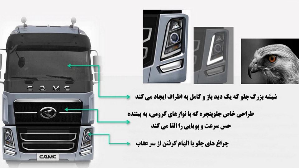 البته کمپانی CAMC این طراحی را الهام گرفته از سر عقاب دانسته و در حالی که لنز اصلی وسط چراغ در حکم چشم عقاب است، دیلایت آن را شبیه به نوک عقاب میداند. حتی کمپانی برای طراحی جلوپنجره و شبکههای داخل آن نیز اعلام میکند که با داشتن حالتی رو به جلو، بیننده را یاد سرعت و حرکت میاندازد. البته خطوط این جلوپنجره با طراحی چراغها و دیگر بخشهای جلو خودرو، همخوانی و هارمونی خوبی دارد.