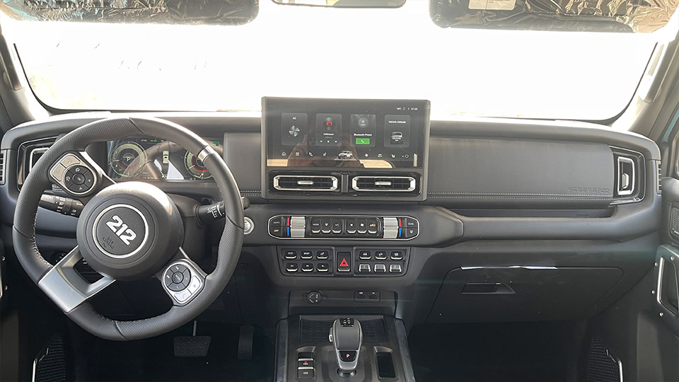 غربیلک فرمان دارای برش D-Cut است و لوگو معرف برند (عدد 212) نه فقط روی آن، بلکه روی دوخت بخیه صندلیها، حکاکی کنسول میانی و دریچه خروجی سیستم تهویه ردیف دوم نیز به چشم میخورد. به دلیل داشتن ساختار معکب مستطیلی اتاق خودرو و همچنین قرارگیری تایر زاپاس بر در پنجم (در عقب)، فضای محفظه بار به نسبت سگمنت تولیدی بسیار جادار و مناسب سفرهای برون شهری و کمپینگ است. هرچند که در کاتالوگهای رسمی، عدد مشخصی برای ظرفیت دقیق محفظه بار اعلام نشده است.