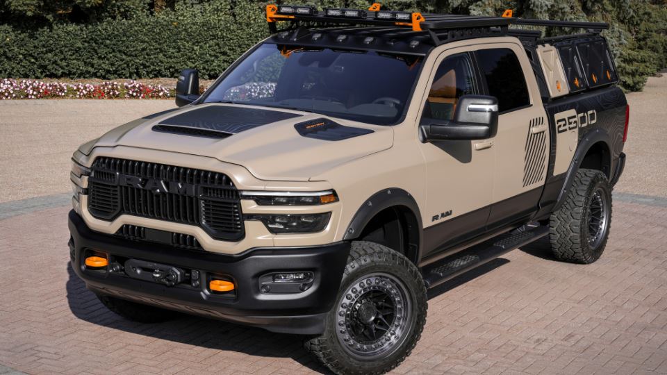 ابتدا بگذارید به سراغ رم 2500 پاور واگن کانسپت برویم، یک پیکاپ 4x4 با ترکیب رنگی خاکی Stealth و مشکی Deep مات و البته جزئیات نارنجی، برای سفر به بیابان آماده به نظر میرسد. از دیگر ویژگیهای ظاهری این خودرو میتوان به سه چراغ سقفی LED از برند TYRI، دو قلاب وینچ در جلو، تجهیزات محفظه بار از برند Leitner، رینگهای 20 اینچ مشکی و خاکستری Anthracite با تایرهای 35 اینچ و رکاب Mopar برای دسترسی به کابین و محفظه بار اشاره کرد.