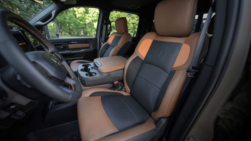 در فضای کابین رم 2500 پاور واگن کانسپت با صندلیهای سفارشی با روکش چرم مشکی و قهوهای Katzkin با دوخت نارنجی، لوگوی Omega M Mopar روی پشتی صندلیها، محفظه مخفی زیر صندلیهای عقب و طراحی جدید صفحه نشان دهنده، روبرو هستیم.