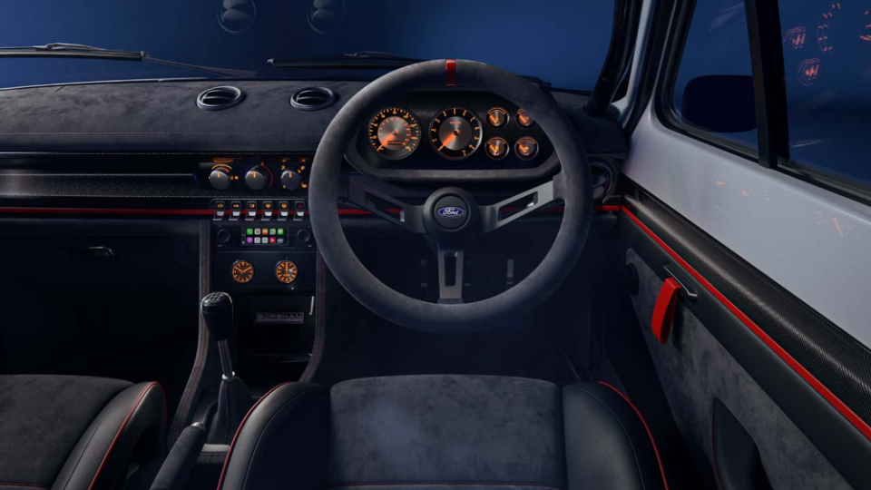 فورد اسکورت RS جدید از نظر ظاهری به اصالت خود وفادار باقی مانده است، اما در زیر پوسته کلاسیک این خودرو، پیشرانه جدید 2.1 لیتری با 296 اسببخار قدرت قرار دارد. این پیشرانه که میتواند تا ده هزار دور بر دقیقه دوران کند، خروجی را از طریق گیربکس 5 سرعته دستی به محور عقب انتقال میدهد. البته مشتری میتواند پیشرانه 1.8 لیتری با 182 اسببخار قدرت و گیربکس 4 سرعته دستی را نیز سفارش بدهد. این اعداد در مقایسه با قدرت خودروهای امروزی چندان زیاد به نظر نمیرسد، اما توجه داشته باشید که فورد اسکورت RS مدرن، تنها 800 کیلوگرم وزن دارد. حتی سبکترین تیپ از نسل ND مزدا میاتا در بازار ژاپن یعنی 990S هم 191 کیلوگرم از فورد اسکورت RS سنگینتر است.