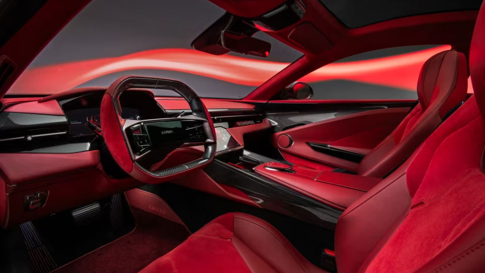 به نظر میرسد که فضای کابین محصول کارما با روکش چرم Crimson Orbit، جیر و قطعات مشکی پیانو تزئین شده است. ویژگیهای دیگر شامل تریم فیبرکربن در کنسول میانی، فضای خالی در عقب برای قرار دادن لوازم و کیف مسافرتی و همچنین سقف شیشهای را نیز میتوان تشخیص داد.