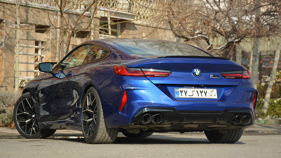 محفظه موتور بسیار کشیده این خودرو آدم را یاد نزدیک‌ترین و اصلی‌ترین رقیبش یعنی مرسدس AMG GT S می‌اندازد. در نمای جانبی یک چیز خاص به چشم می‌آید و آن هم توپُر بودن گلگیر عقب این خودرو است. همان تکنیک خاصی که آمریکایی‌ها روی عضلانی‌های درشت‌اندام خود اجرا می‌کنند. ماستنگ و چلنجر. در همین نما، قوس زیبای سقف و پنجره‌های کوتاه M8 به چشم می‌خورد که کاملاً ذات اسپرت‌گرا بودنش را به رخ می‌کشد. آنچه در پشت این خودرو می‌بینیم، برشی آشنا از خودروهای آینده‌نگر شرکت یعنی iX است. چراغ‌های باریک و کشیده که با زوایایی تند و شکننده هماهنگی چشم‌نوازی با سپر و اگزوز و دیفیوزر پیدا کرده‌اند.