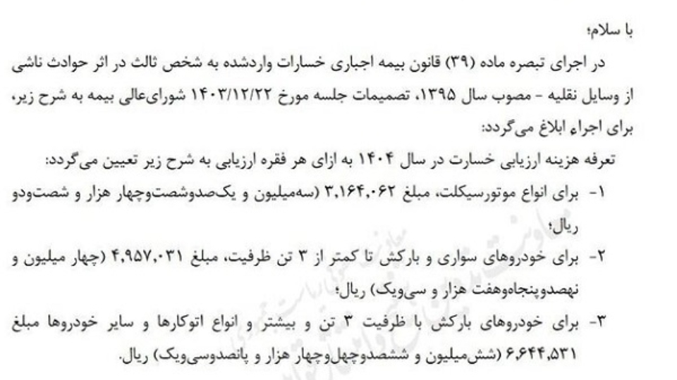 بیمه مرکزی جمهوری اسلامی ایران طی نامهای رسمی، تعرفههای جدید ارزیابی خسارت ناشی از حوادث مرتبط با وسایل نقلیه برای سال ۱۴۰۴ را اعلام کرد. این تعرفهها بر اساس مصوبات جلسه مورخ ۲۲ اسفند ۱۴۰۳ شورای عالی بیمه تعیین و به انجمن ارزیابان خسارت حرفهای صنعت بیمه ابلاغ شده است. مطابق این نامه، هزینه ارزیابی خسارت بر اساس سه دسته اصلی خودروها تعیین گردیده است: