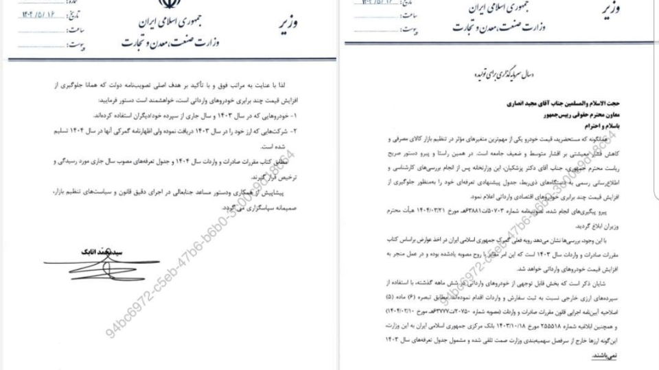 در نامه آمده است: قیمت خودرو یکی از مهمترین متغیرهای مؤثر در تنظیم بازار کالای مصرفی و کاهش فشار معیشتی بر اقشار متوسط و ضعیف جامعه است. در همین راستا و پیرو دستور صریح ریاست جمهوری، دکتر پزشکیان این وزارتخانه پس از انجام بررسیهای کارشناسی و اطلاع رسانی رسمی به دستگاههای ذیربط، جدول پیشنهادی تعرفهای خود را به منظور جلوگیری از افزایش چند برابری خودروهای اقتصادی وارداتی اعلام کرد.
