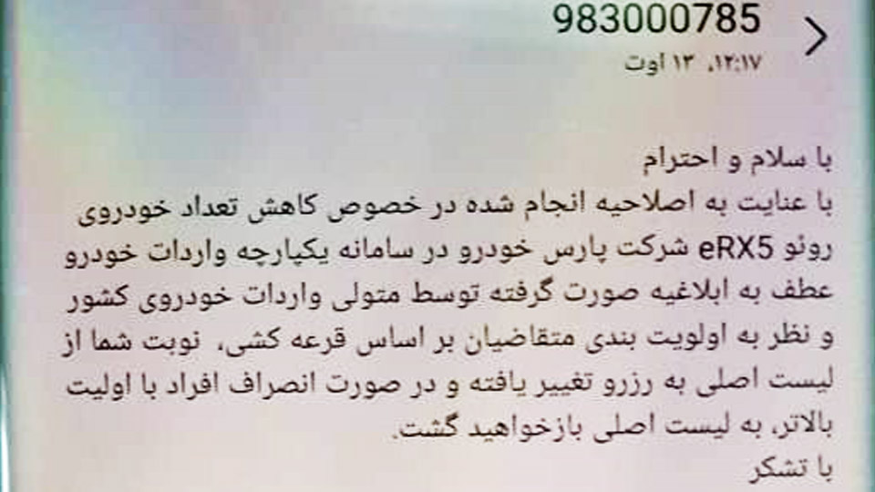 در این پیامک اعلام شده که عطف به ابلاغیه صورت گرفته توسط متولی واردات خودروی کشور و نظر به اولویتبندی صورت گرفته، نوبت شما از فهرست اصلی به رزرو تغییر یافته است.