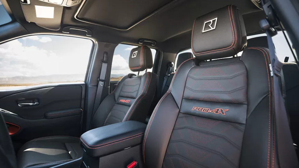 در فضای کابین نیسان فرانتیر Pro-4X R میتوان نشان R را روی پشتسری صندلیها مشاهده کرد. صفحه نشاندهنده 7 اینچ و نمایشگر لمسی 12.3 اینچ در سایر تیپهای فرانتیر 2026 نیز دیده میشود.