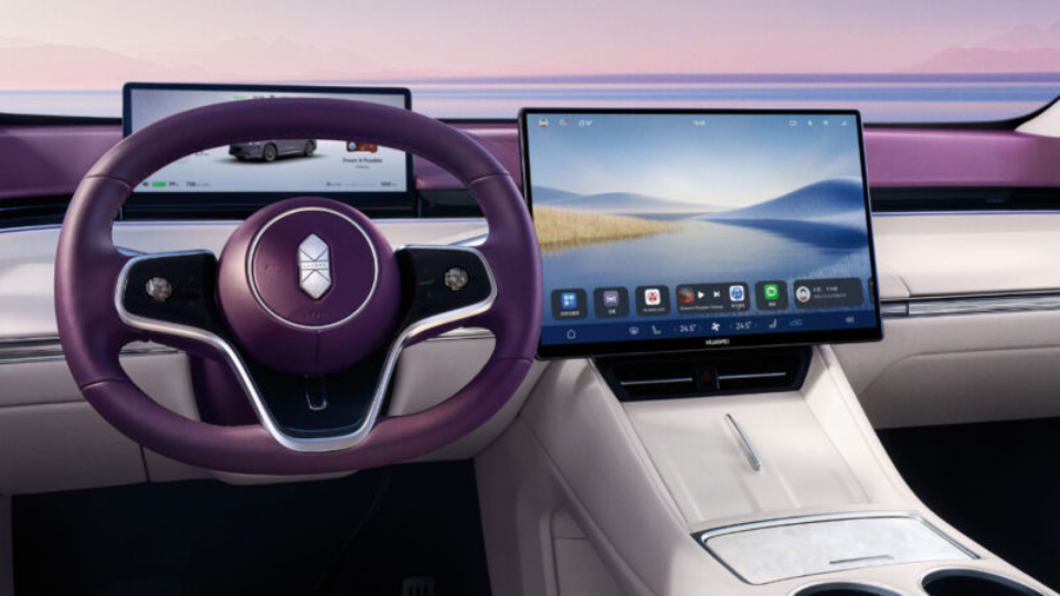 در فضای کابین لوکسید R7 مدل 2026 با صفحه نشاندهنده 12.3 اینچ، نمایشگر 16.1 اینچ لمسی با رابط کاربری HuaweiOS، فرمان بیضوی سه پره و اهرم دنده روی ستون فرمان روبرو هستیم. در مدل جدید میتوان رنگ بنفش را برای تریم داخلی سفارش داد.