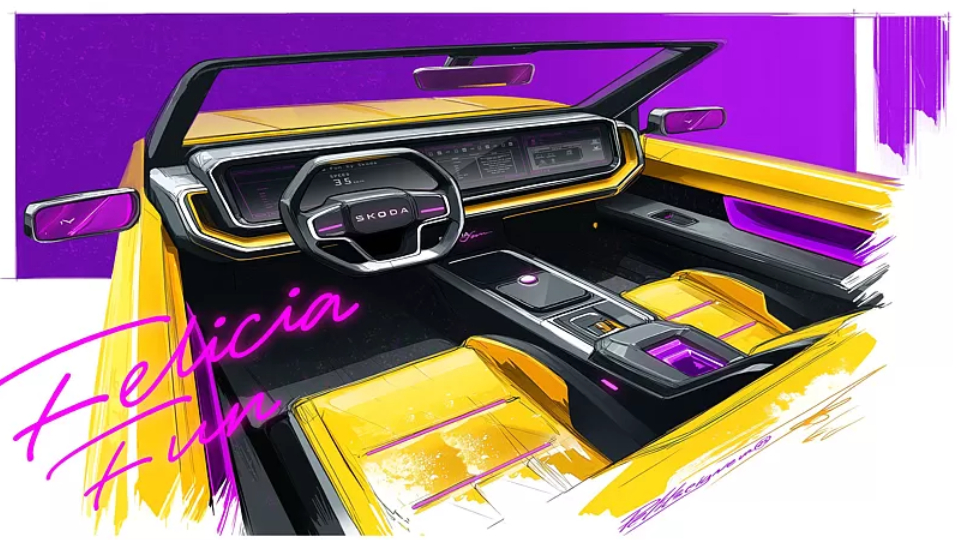 در یکی از تصاویر میتوان فضای داخلی فلیسیا فان کانسپت را هم مشاهده کرد. طبیعی است که سطح داشبورد یک خودروی کانسپت در سال 2025 با چند نمایشگر پوشیده شده باشد، اما طراح با الهام از خطوط مستقیم برای شکل دادن به داشبورد و همچنین استفاده از بازیهای ویدیویی دهه 90 میلادی برای گرافیک نمایشگرها، ارتباط جالبی بین نوستالژی و فناوریهای امروزی، برقرار کرده است.