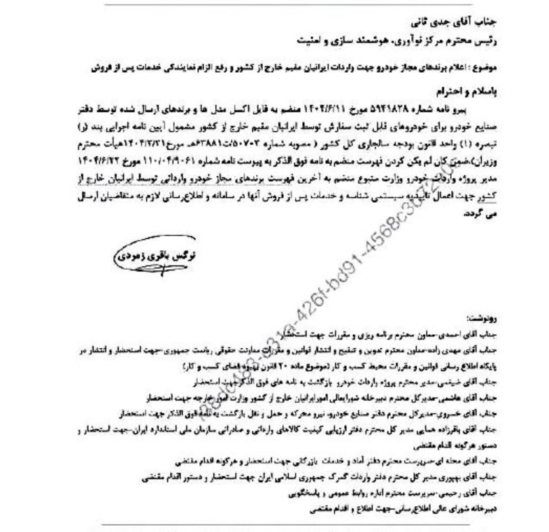 حال دفتر مقررات صادرات و واردات وزارت صمت با هدف اجرای مصوبه هیات وزیران و اجرای آییننامه واردات خودرو، فهرست رسمی و تفصیلی برندها و مدلهای مجاز برای ثبت سفارش توسط ایرانیان مقیم خارج از کشور را ابلاغ کرد.