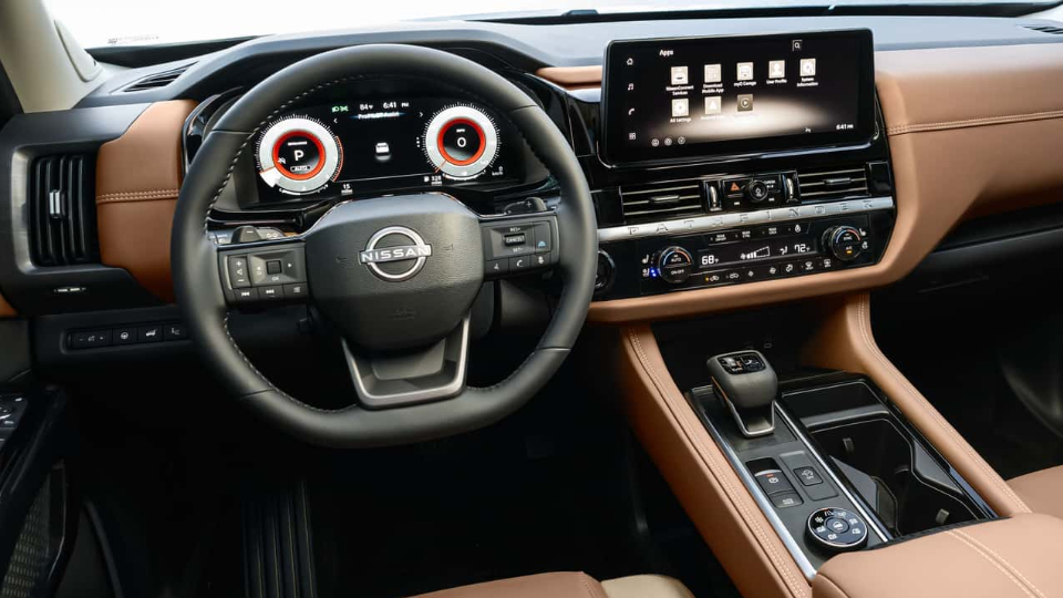 اما بزرگترین بروزرسانی در داخل کابین به چشم میخورد. تمام تیپهای پتفایندر 2026 به صورت استاندارد به نمایشگر لمسی 12.3 اینچ با پشتیبانی از اپل کارپلی و اندروید اتو بیسیم، مجهز میشود. در تیپ SL و بالاتر، صفحه نشاندهنده 12.3 اینچ نیز اضافه میشود. نیسان همچنین پد شارژ بیسیم را با خنککننده جدید و خروجی شارژ بالاتر بروزرسانی کرده و توان خروجی را از 5 به 15 وات افزایش داده است. تیپهای راک کریک (Rock Creek)، SL و پلاتینیوم به دوربین دید فراگیر با وضوح بالا مجهز هستند، درحالیکه قابلیت کاپوت نامرئی که در مدل 2026 معرفی شد نیز همچنان حفظ شده است. این قابلیت در تیپ آفرودی راک کریک، مشاهده بخش زیرین جلوی خودرو را امکانپذیر میکند.