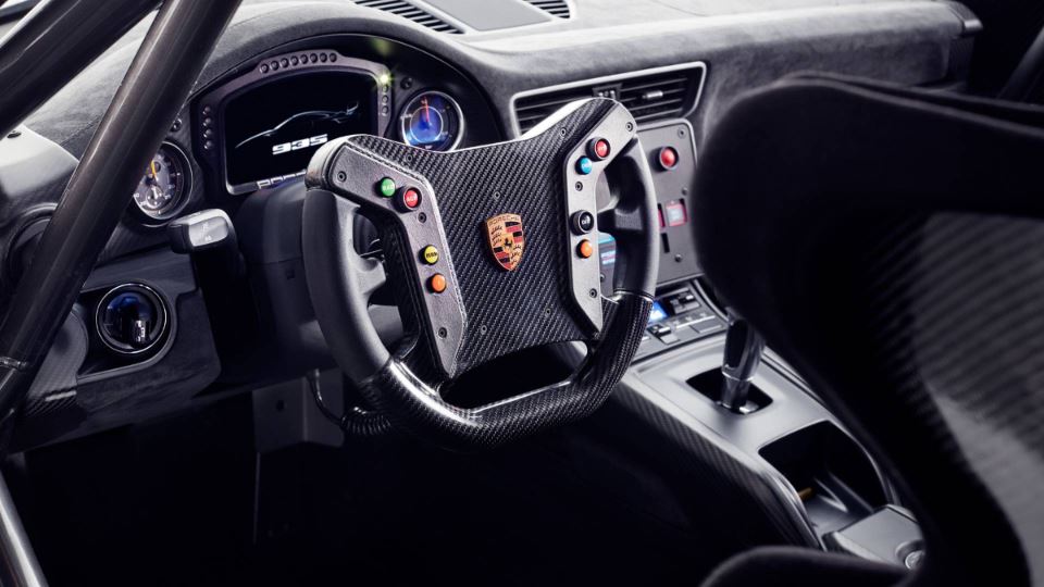 یکی از جذابترین بخشهای ظاهری این خودرو را میتوان رینگهای قرمز رنگ آن دانست. آینههای جانبی برگرفته از 911 RSR بوده و طراحی خروجیهای اگزوز نیز از مدل 908 الهام گرفته شده تا گذشته درخشان این مدلها یادآوری شود. این نگاه به گذشته حتی در کابین 935 نیز وجود دارد که بهعنوان مثال میتوان اهرم تعویض دنده با پوشش چوبی را مثال زد که در گذشته در مدل 911 GT3 R نصب شده است.