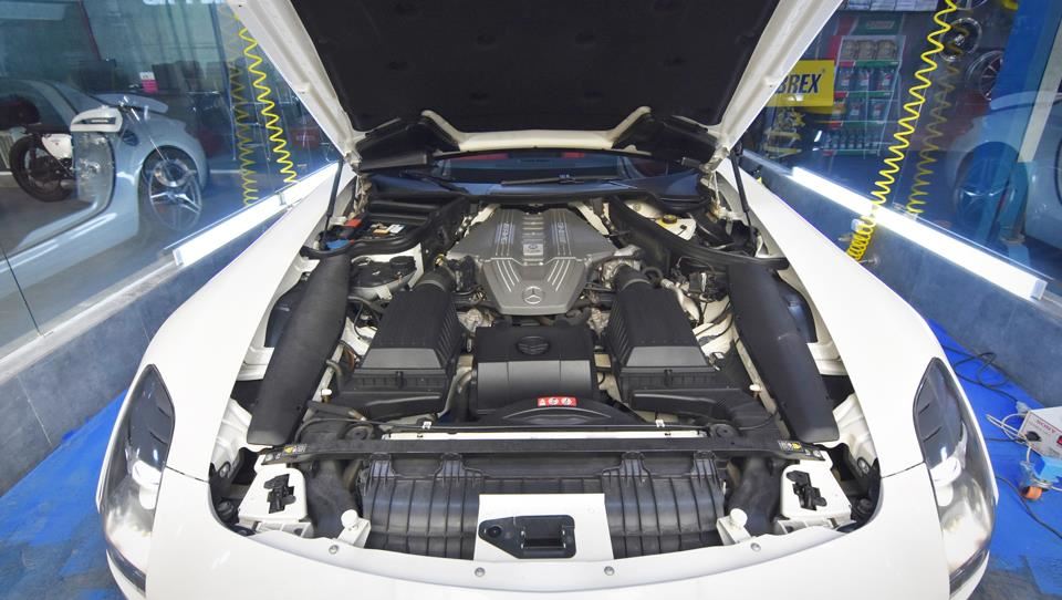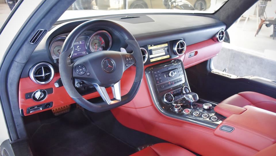 این خروجی‌ها به کمک یک جعبه‌دنده هفت سرعته آام‌گ SPEEDSHIFT DCT دو کلاچه نیمه اتوماتیک و به کمک یک میل‌گاردان فیبر کربنی سبک به چرخ‌های عقب ارسال می‌شوند. با این ترکیب فنی، مرسدس SLS آام‌گ صفر تا صد را در 3.8 ثانیه می‌تواند پر کند و حداکثر سرعتی برابر با 315 کیلومتر برساعت دارد. جالب است بدانید این خودرو قادر است سرعتش را ظرف 11.7 ثانیه از صفر به دویست کیلومتر برساعت برساند. حالت‌های رانندگی قابل انتخاب این خودرو شامل C (حالت مصرف بهینه)، S (اسپرت)، S+ (اسپرت پلاس) و M (دستی) هستند. شرکت مرسدس بنز هیچ‌وقت جعبه‌دنده دستی برای این خودرو ارائه نکرد.
