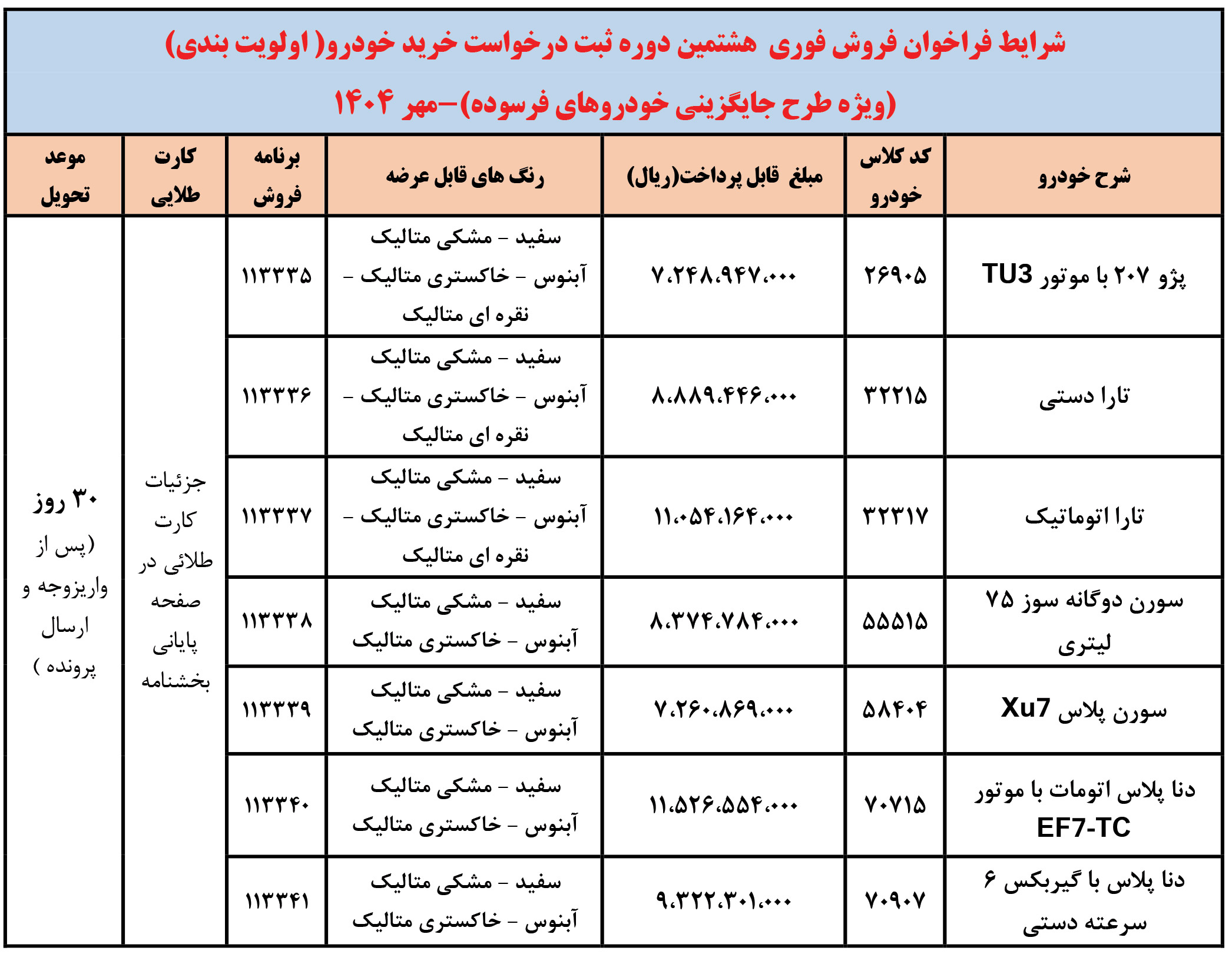 با اعلام برندگان قرعه کشی طرح نوسازی ایران خودرو، فراخوان واریز وجه منتخبین، از روز شنبه مورخ 1404/07/26 ویژه متقاضیانی که در طرح فروش فوری و همچنین فروش فوق العاده شرکت کرده‌اند، مطابق جداول زیر اعلام شده است: